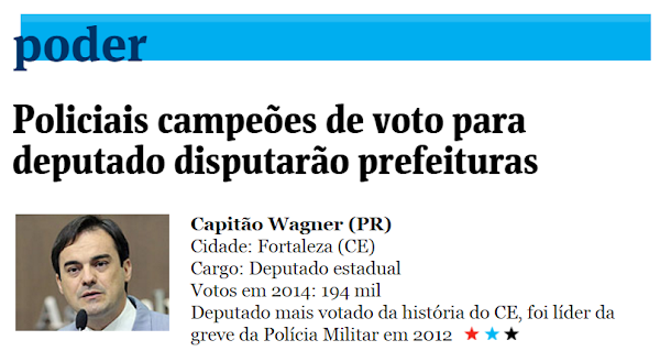 "Eles são policiais, campeões de votos nas últimas eleições para deputado e agora querem ser prefeitos de capitais. Empunhando as bandeiras da segurança e da defesa da família, preparam-se para disputar as eleições na condição de "outsiders", buscando superar candidatos de grupos políticos tradicionais. [...]