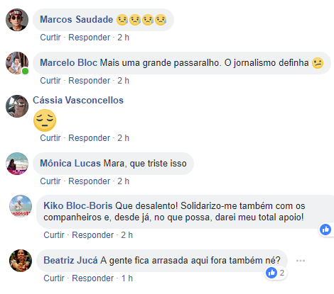 Nas redes sociais, companheiros jornalistas lamentam as novas demissões ocorridas no Sistema Verdes Mares. Foram demitidos, entre outros, os jornalistas Edson Silva, Maristela Crispim, Carlos Eugênio Giovana Sampaio, Eduardo Queiroz e Cid Barbosa - isso para citar os que integravam a redação e fotografia do Diário do Nordeste.
