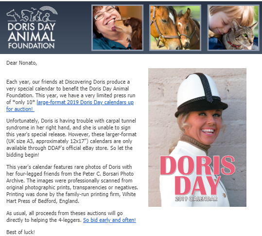 Recebo correspondência da turma da Fundação Animal Doris Day , com quem há tempos me correspondo, anunciando a programação da entidade para 2019 e lançando o famoso calendário que há décadas marca o trabalho do órgão em defesa dos animais.